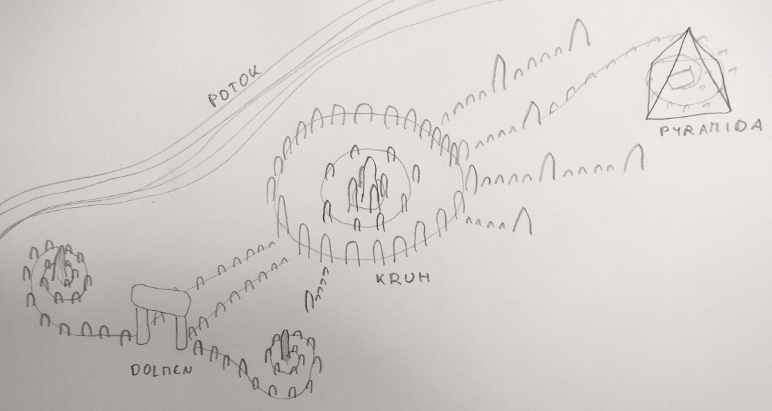 Orientační obrázky základního trojkruží, dolmenu, spirály s pyramidou a dalších připojení: